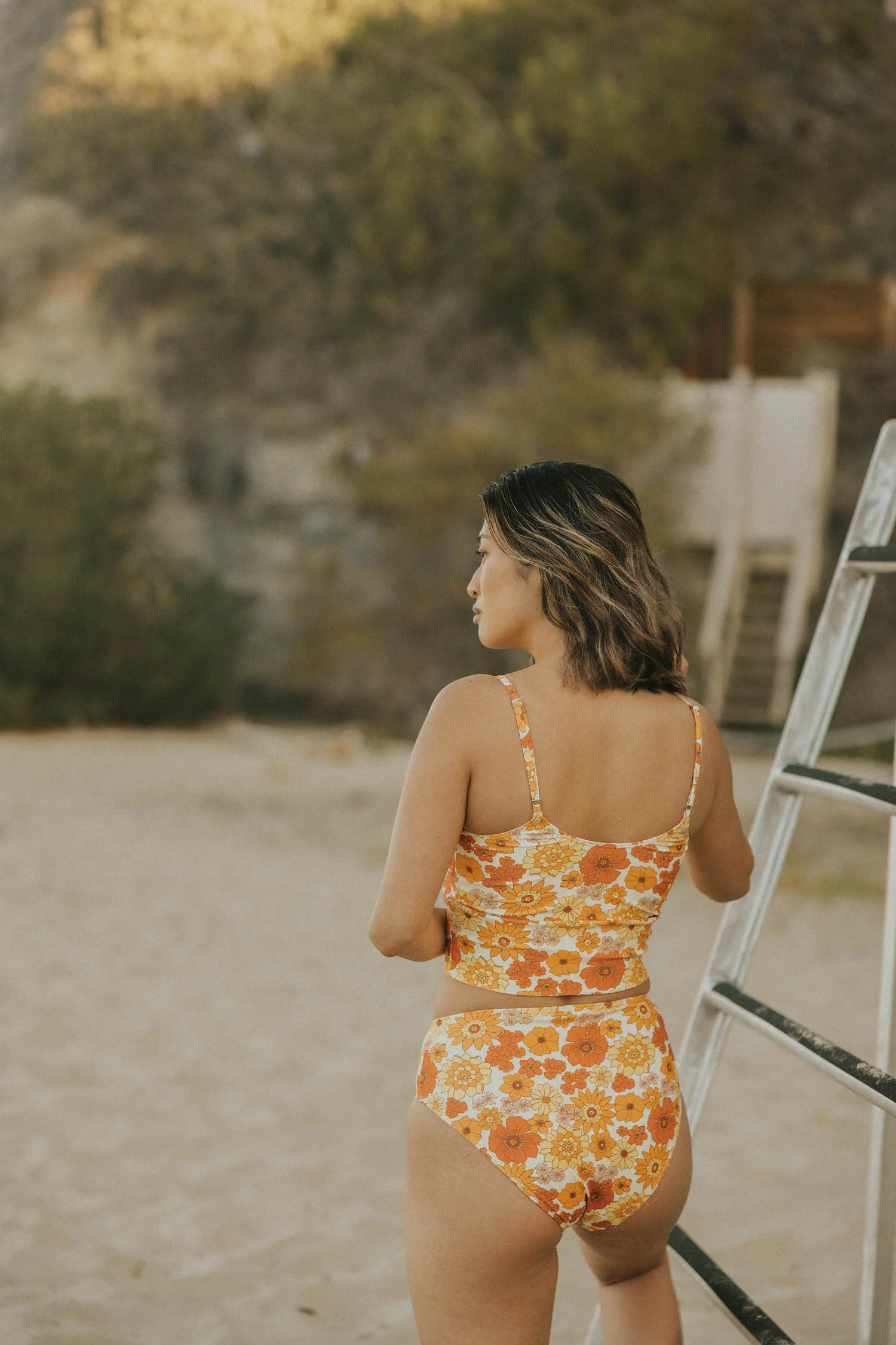 This retro-inspired modest floral swim top is sure to be a summer staple! Warm-colored florals on a soft yellow background make this pattern one of our customer favorites! This floral top is the perfect mix of trendy and practical. The Flora Top features a scoop neckline and back, with adjustable straps for a customizable fit. This top works great for a more active day!